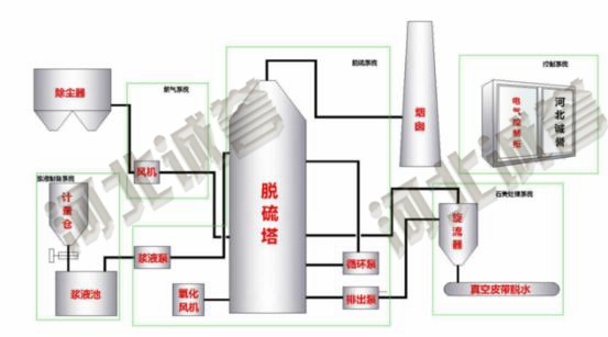 石灰石-石膏法脫硫在電廠鍋爐、供暖鍋爐等工業(yè)鍋爐窯爐煙氣治理方面是應(yīng)用較為廣泛的一種脫硫工藝,該工藝采用石灰石作脫硫吸收劑,吸收劑與水混合攪拌制成石灰石漿液。在脫硫塔內(nèi),石灰石漿液與煙氣接觸混合,煙氣中的SO2與漿液中的碳酸鈣以及鼓入的氧化空氣進(jìn)行化學(xué)反應(yīng),SO2被脫除,反應(yīng)產(chǎn)物為石膏。脫硫石膏漿經(jīng)脫水裝置脫水后回收。